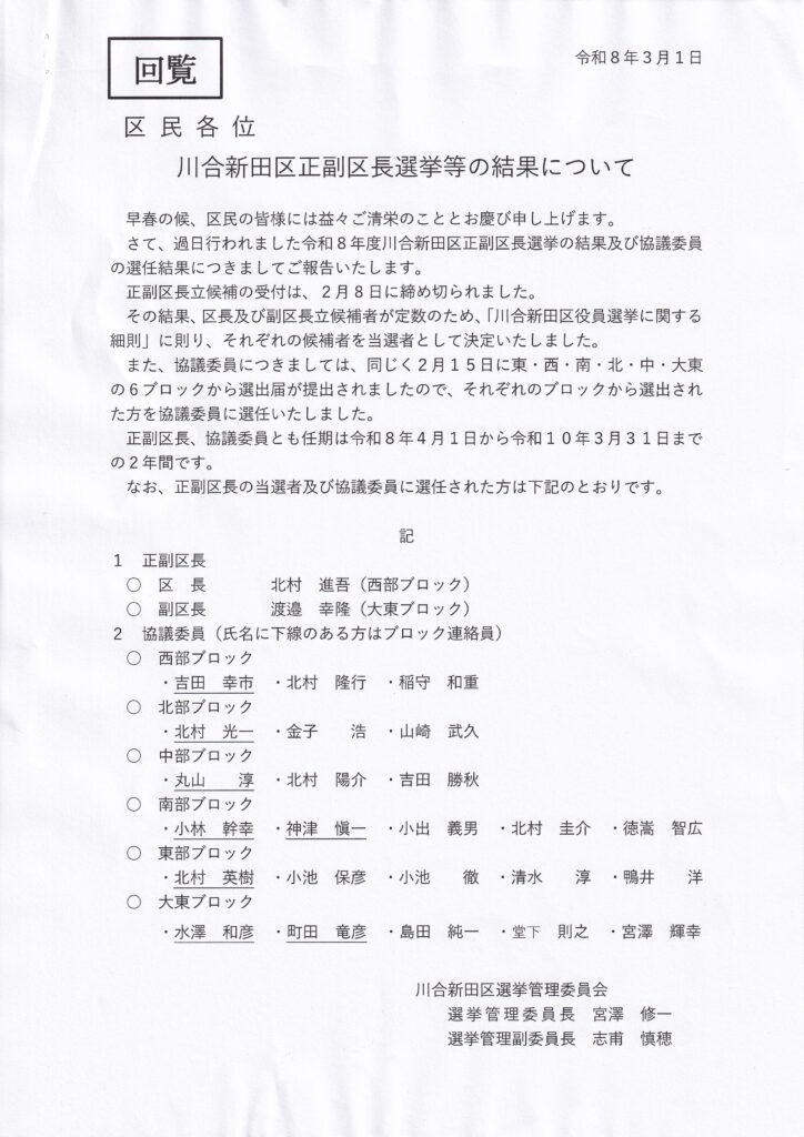 川合新田区正副区長選挙等の結果について