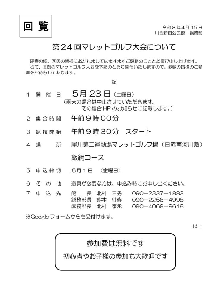 【5/23開催】マレットゴルフ大会 2026.04.15 お知らせ 5/23(土)マレットゴルフ大会が開催されます。 皆様の参加をお待ちしています。 申込は下記googleフォームか電話にてお申し込みください。 Googleフォーム申込先へ